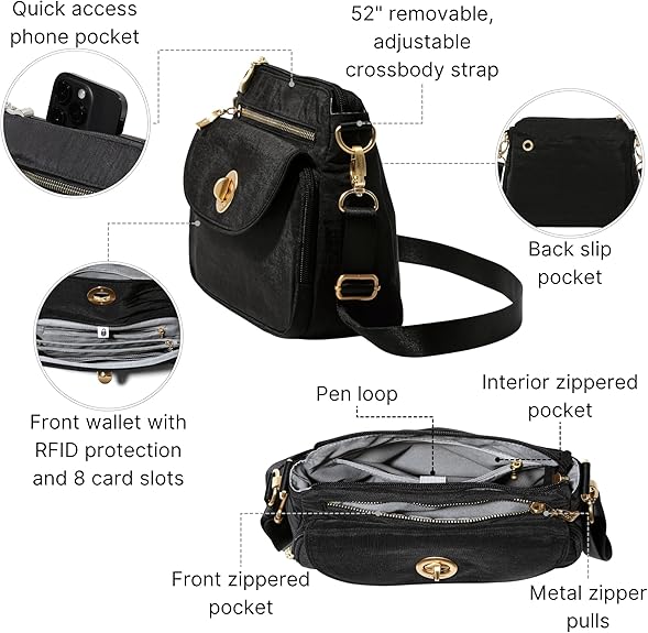 - PROTECT YOUR PEACE OF MIND: Featuring a built-in RFID-blocking Card Holder, this travel purse for women ensures that your personal information remains safe during everyday commutes and adventurous travels.