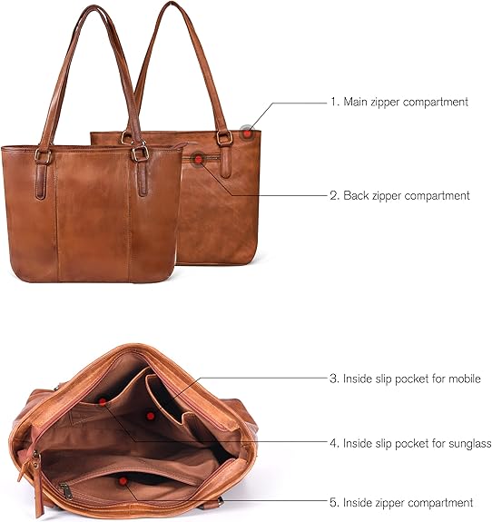 • Key Features: Stay organized with our women’s shoulder bag. It features an exterior zip pocket, interior zip compartment, dedicated sunglass holder, and mobile holder. Measuring 10.5 x 15 x 3 inches, this leather tote bag has a robust strap buckle that adds a contemporary touch