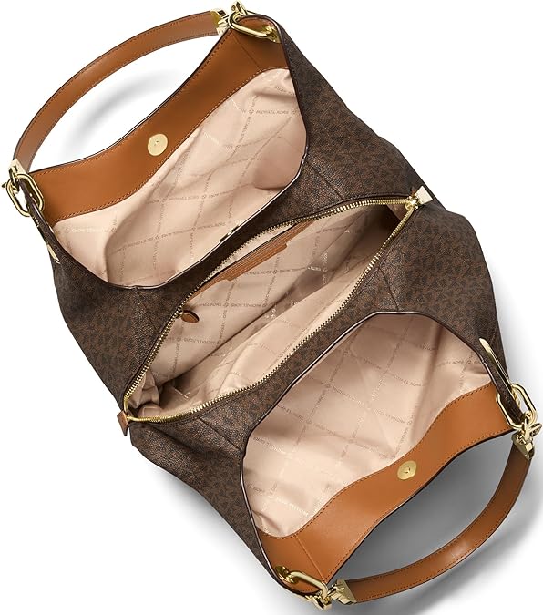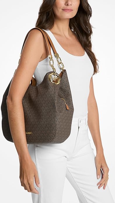 - Our Michael Kors Lillie shoulder bag combines timeless glamour with everyday functionality. Designed in a slouchy shape and detailed with polished hardware, this carryall features our Signature logo-print canvas and opens to reveal two snap compartments and a secure center zip pocket. Count on it to tote your essentials with stylish ease.