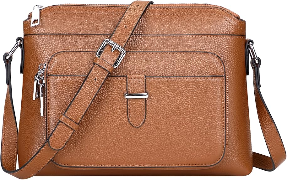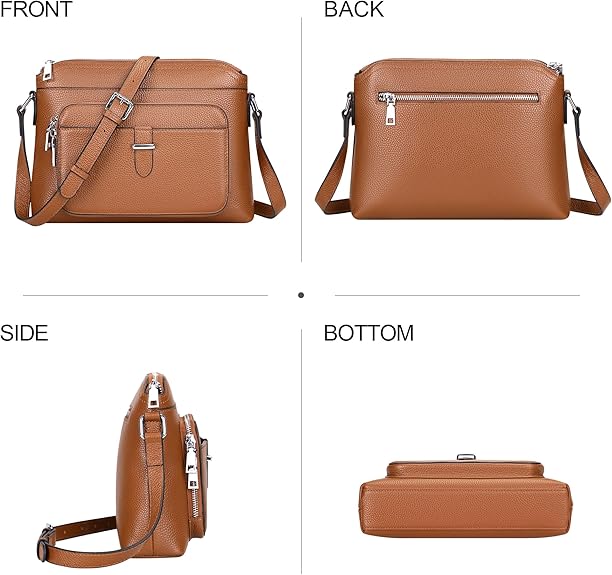 - Structure: The front of genuine leather crossbody purses for women has a magnetic pocket and a zipper pocket. The back has a zipper pocket. The inner structure has 1 main open compartment, and 2 slip pockets, 2inner zipper pockets, and a key strap.